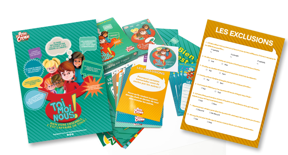 Un kit éducatif ToiMoiNous destiné à faciliter la conception, avec les enfants, d’un ensemble de mesures visant à la prévention des violences à l’école, grâce à des témoignages et des débats.